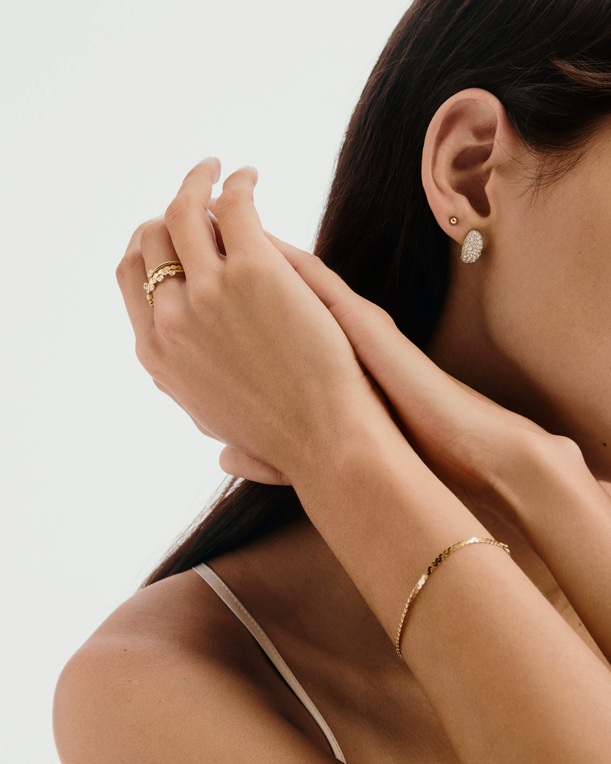 Eye-catching, stand-out huggies from our best selling Dôme Collection make every look special. The cobblestone setting used here is known for its density of lab grown diamonds— using different sized stones to create an expanse of smooth, unbroken shine.